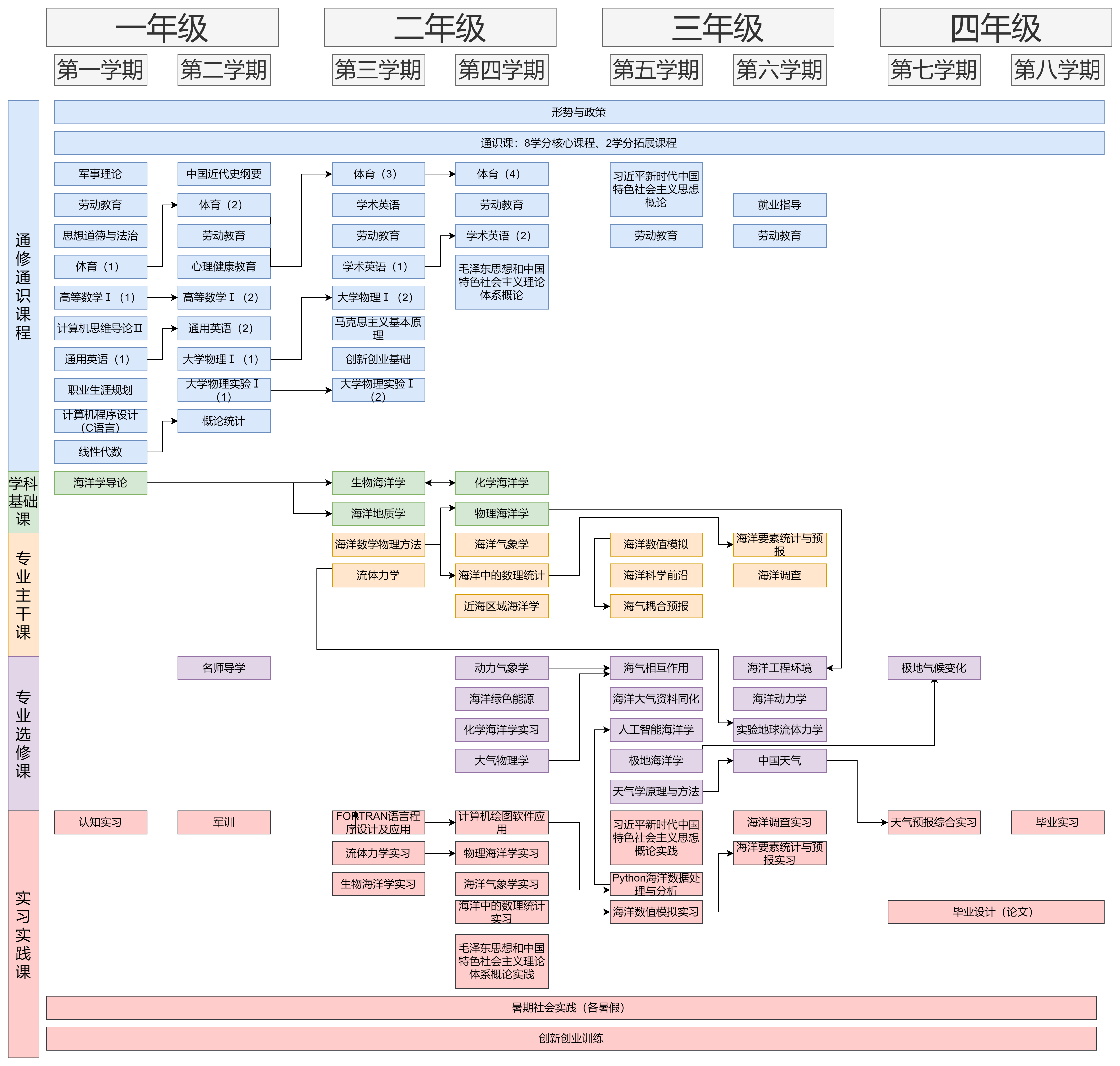 特色课程:人工智能海洋学、实验地球流体力学、海气相互作用、极地海洋学、海洋绿色能源、海洋工程环境、海洋动力学、动力气象学、海洋大气资料同化等。