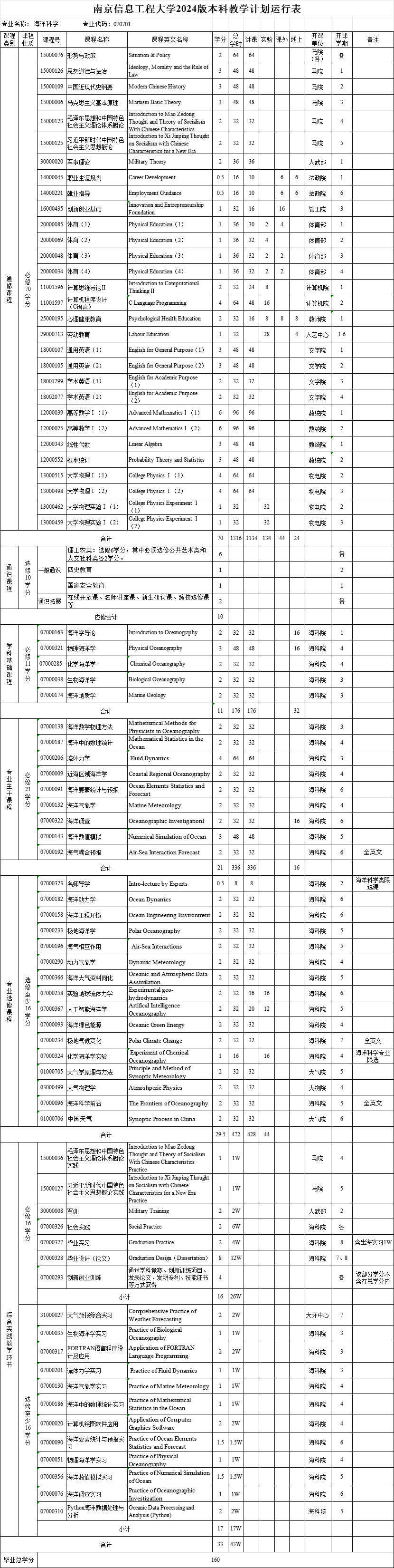 专业核心课程:海洋学导论、流体力学、物理海洋学、海洋数值模拟、海洋数学物理方法、海洋要素统计与预报、近海区域海洋学、海洋气象学、海洋调查、海气耦合预报(全英文)等。