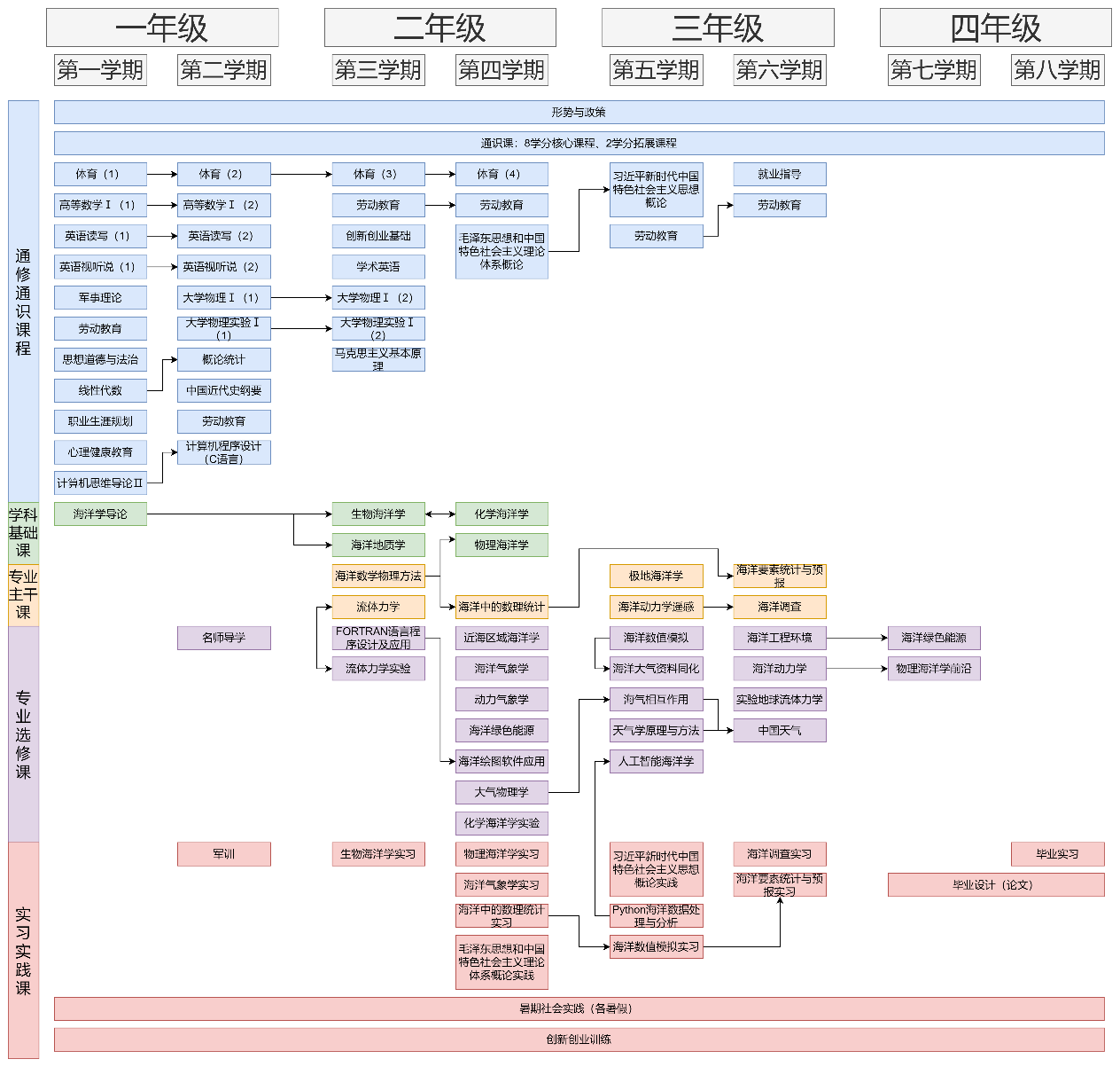 (2)基础知识和专业知识:具有扎实的高等数学、大学物理学、外语、计算机基础、科技信息数据处理的理论和应用知识。系统地掌握海洋科学,重点是物理海洋学、海洋气象学、海气要素监测与预报、海气相互作用等方面的经典基本理论、分析方法和应用技能;熟悉相关的海洋科学基础知识包括海洋化学、海洋生物、海洋地质等。