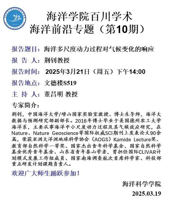 下一条:海洋学院百川学术-海洋前沿专题(第9期):特邀中国科学院海洋所沙忠利研究员作学术报告
