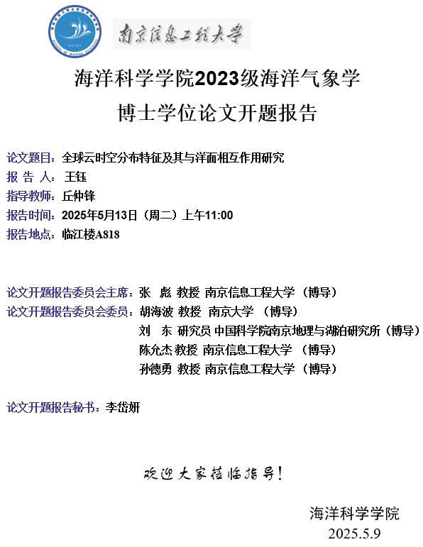 上一条:海洋气象学博士开题-2022级邓晓茜、2023级王婷