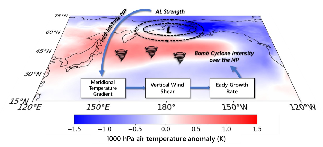 图2.北太平洋阿留申低压影响该地区爆发性气旋强度的机制示意图。图中填色部分为北太平洋指数超过1980-2017年的90百分位数时1000 hPa气温的异常值。
