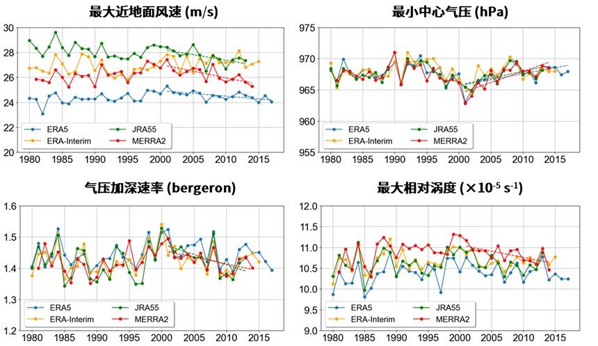 图1.再分析资料中北太平洋爆发性气旋强度指标自1980年以来的年平均时间序列。虚线表示对应指标自2001年以来存在显著(p < 0.05)的变化趋势。