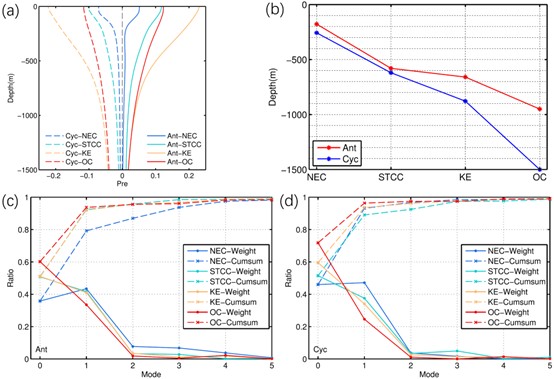 图2(a)合成涡旋垂向结构;(b)合成涡旋影响深度;(c)反气旋式涡旋垂向结构各模态权重比例;(d)气旋式涡旋垂向结构各模态权重比例