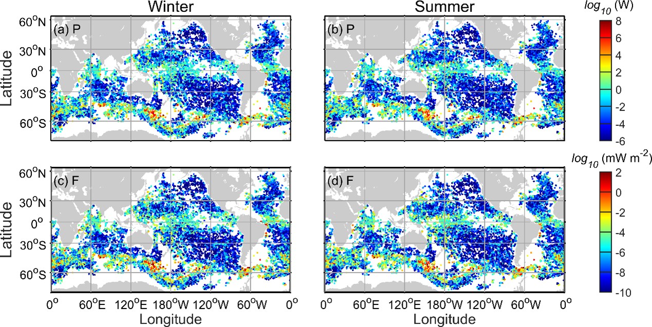 图2全球海山诱导的山后波能量(a,b)与通量(c,d)的空间分布。图(a,c)为冬季分布,总能量为0.68GW,平均通量为0.12 mW·m⁻²、(b,d)为夏季分布,总能量为0.42GW,平均通量为0.09 mW·m⁻²。