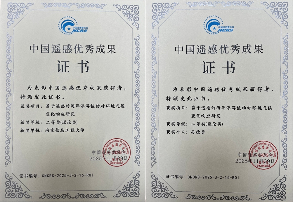 近日,第二十三届中国遥感大会在广州举行。我院孙德勇教授课题组申报的“基于遥感的海洋浮游植物对环境气候变化响应研究”荣获中国遥感优秀成果二等奖,这是继2023年荣获“中国遥感优秀成果一等奖”后,再次获得突破。