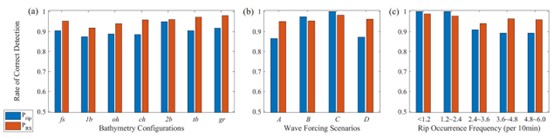 图2.本方法在(a)不同地形、(b)波浪条件和(c)裂流发生频率下的检测准确率分布情况