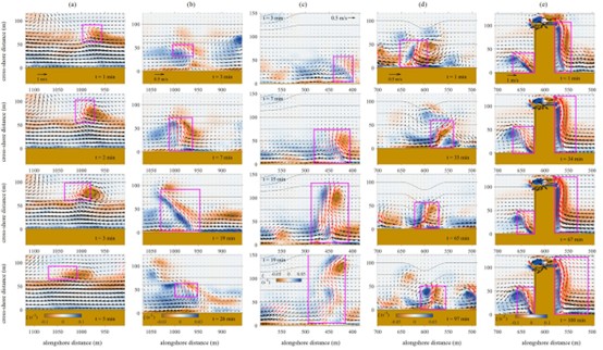 海岸裂流是具有微尺度、局地性、突发性强的滨海海洋灾害,一旦发生可对游客和市民造成严重的生命威胁。数值模拟能够为海岸裂流的预警报提供关键信息,但从模拟流场中检测裂流发生情况仍主要依赖人工解译,目前缺少系统性方法自动提取裂流特征。针对此,研究团队提出了一种结合了裂流的物理特性与其时空动态特征的检测方法。该方法基于裂流的运动学和形态学特征建立了多维度判别准则,并设计了多步骤识别与追踪流程,能够有效检测不同类型的裂流并捕捉其时空演化过程,在不同地形和波浪条件工况下验证准确率超过90%。
