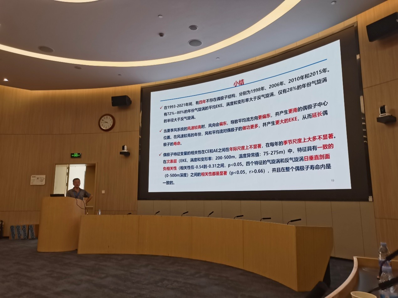 会议期间,董昌明教授作了题为“一种新型海洋气象智能预报模式系统”的专题报告,从海洋动力方程智能求解、智能降尺度、海洋模式智能参数化以及海洋预报智能订正四个子系统展开详细阐述。金梅兵教授作了题为“The lifespan mechanism of dipole eddies to the east of Vietnam and their intrinsic connections”的特邀报告。他在报告中深入剖析了越南东部偶极涡旋的生命周期机制及其内在关联,指出在1993至2021年间,气旋式涡旋的能量与强度普遍高于反气旋式涡旋,强风年份会显著延长海洋涡旋的寿命。张宁宁副教授的口头报告“ENSO调控下的南海次表层热浪/冷浪—南海贯穿流的作用”同样引起广泛关注。该研究聚焦ENSO(厄尔尼诺-南方涛动)对南海次表层热浪和冷浪的调控机制,并揭示了南海贯穿流在其中所起的关键作用。博士生薛静远展示了“基于混合Vision Transformer-UNet的风场空间降尺度方法”,该模型在提升风场空间分辨率与精度方面成效显著,并荣获本届年会“最佳报告奖”。在闭幕式上,董昌明教授作为会议召集人之一对本届年会作总结发言,系统梳理了会议成果,并对南海年会的未来发展方向作出展望。