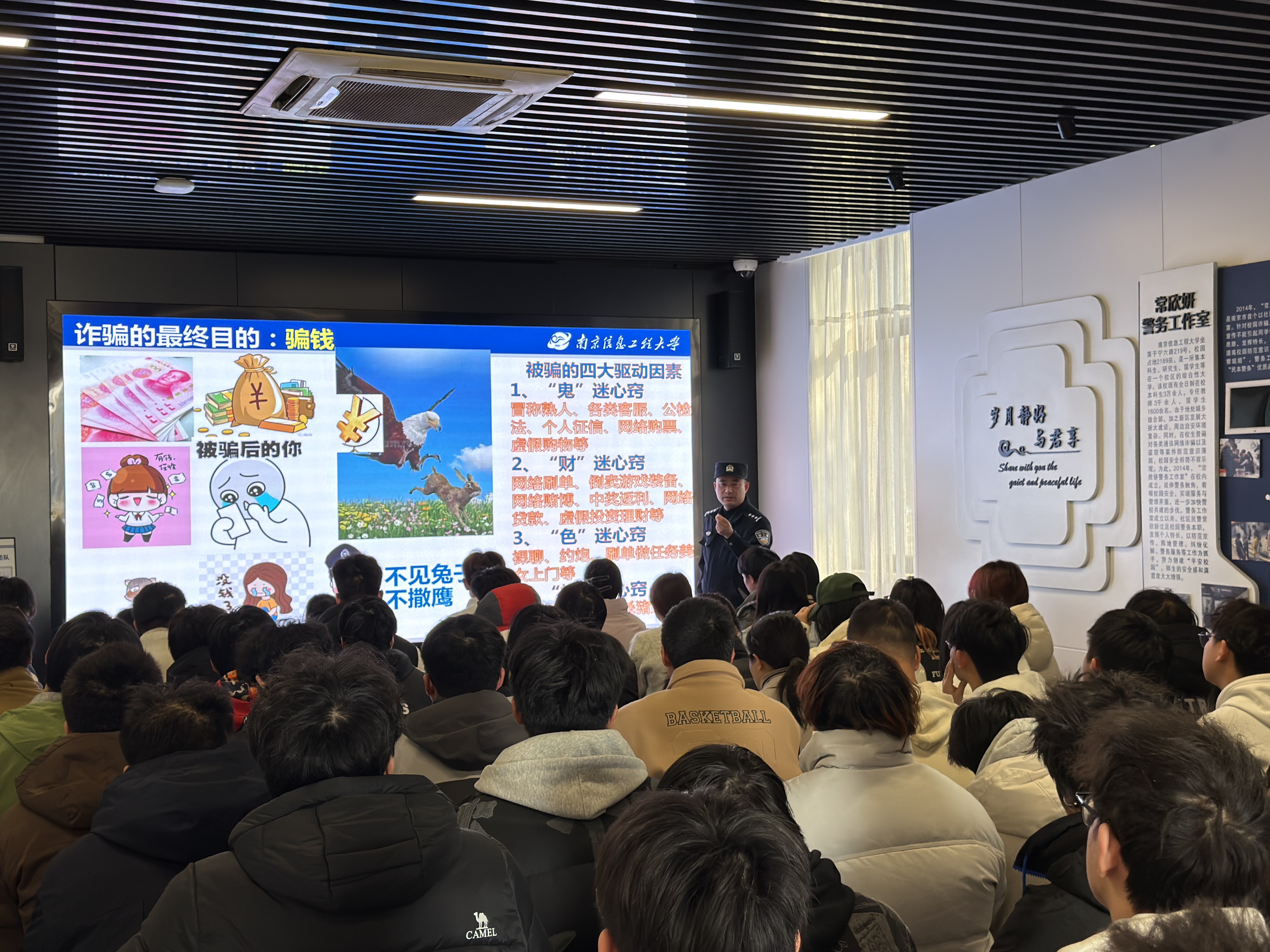 为切实增强全体学生的安全意识,提升防范各类风险的能力,确保学子平安、文明、有序离校,度过一个安全祥和的假期,1月13日,海洋科学学院面向2025级全体学生在学校警务平台集中组织开展寒假离校前安全教育活动。本次活动重点聚焦防范电信网络诈骗、理性应对网络舆情、离校旅途与假期安全等内容,实现安全教育全覆盖、入人心。学院邀请南京市公安局南京江北新区分局孙跃警官主讲,学院党委书记陈相勤出席,副书记水泱、学办主任曹芸全程参与。