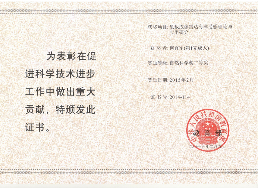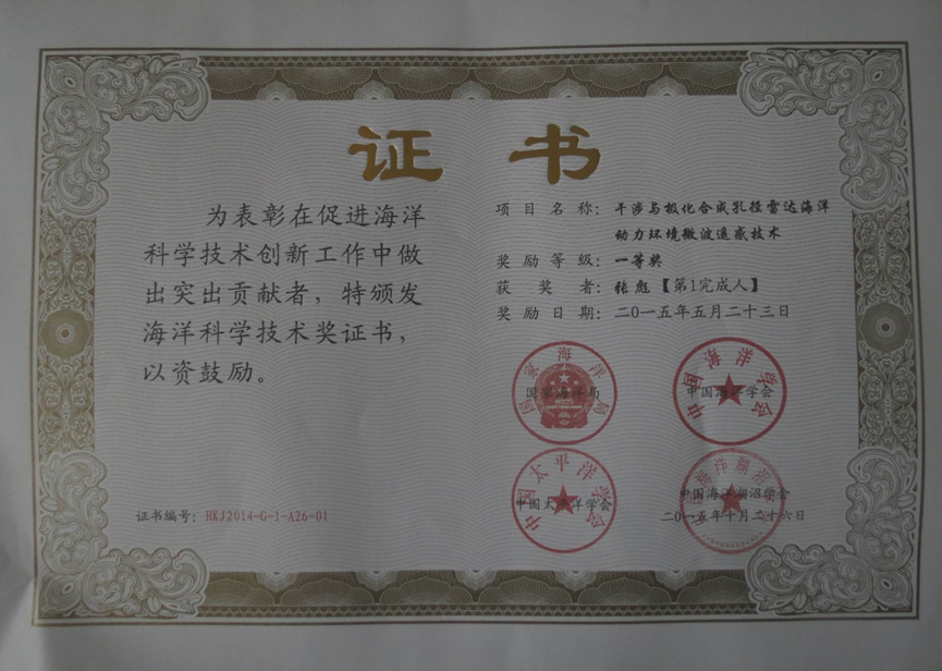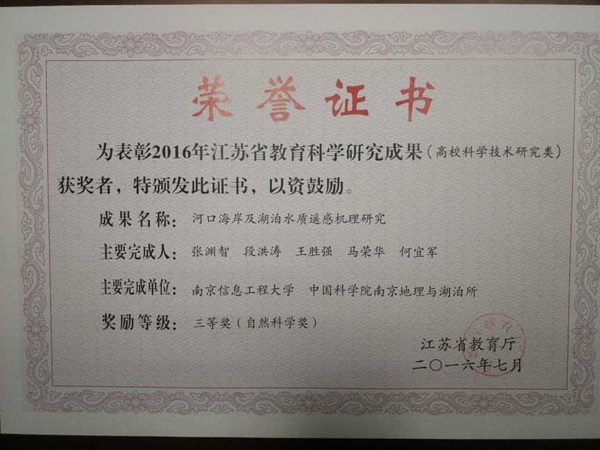 1.何宜军,张彪,丘仲锋,张渊智,孙德勇,申辉,邢小罡,陈忠彪,江苏省科学技术奖一等奖,2017年; 2.何宜军,张彪,谢涛,申辉,2014年度教育部自然科学奖,二等奖,2015年2月; 3.张彪,何宜军,申辉,2014年海洋局海洋科学技术奖,一等奖,2015年5月; 4.董昌明等,2016年度国家海洋技术奖,二等奖,2017年3月; 5.董昌明2016年度,国际海洋优秀图书奖,2017年6月; 6.董昌明等,2016年度,第四届江苏省海洋与渔业科技创新奖,一等奖,2017年1月。 7.张渊智等,2016年江苏省教育科学研究成果(高校科学技术研究类)三等奖(自然科学类)。 8.黄啸谷,六大人才高峰,2016.9-2018.8。 9.黄啸谷,香江学者计划项目,2017.1-2019.1。 10.张彪,江苏省333人才工程,2017.1-2019.12。 11.郑改革,江苏省333人才工程,2017.1-2019.12。 |